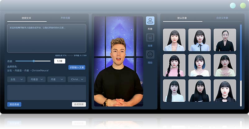 广州原本 . 数字人视频合成利用最领先的TTA技术,一站式合成逼真的数字人的形象、声音、口型和动作,还可以叠加任意视频背景。